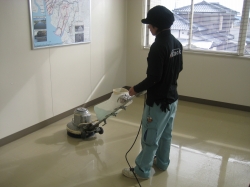 床面ポリッシャー洗浄後、拭き上げ、乾燥で